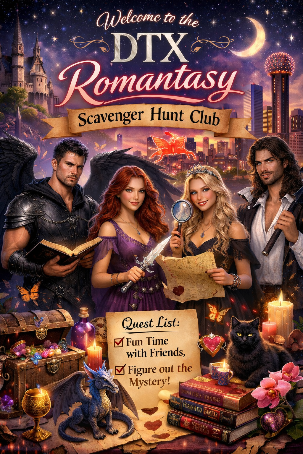 The DTX Romantasy Scavenger Hunt club is beginning with their first annual scavenger hunt! We pride ourselves in creating unique and fun scenarios for sleuths around the Dallas-Fort Worth area who want to celebrate their enjoyment of all things Romantic and Fantasy literature and to have a fun time with friends!